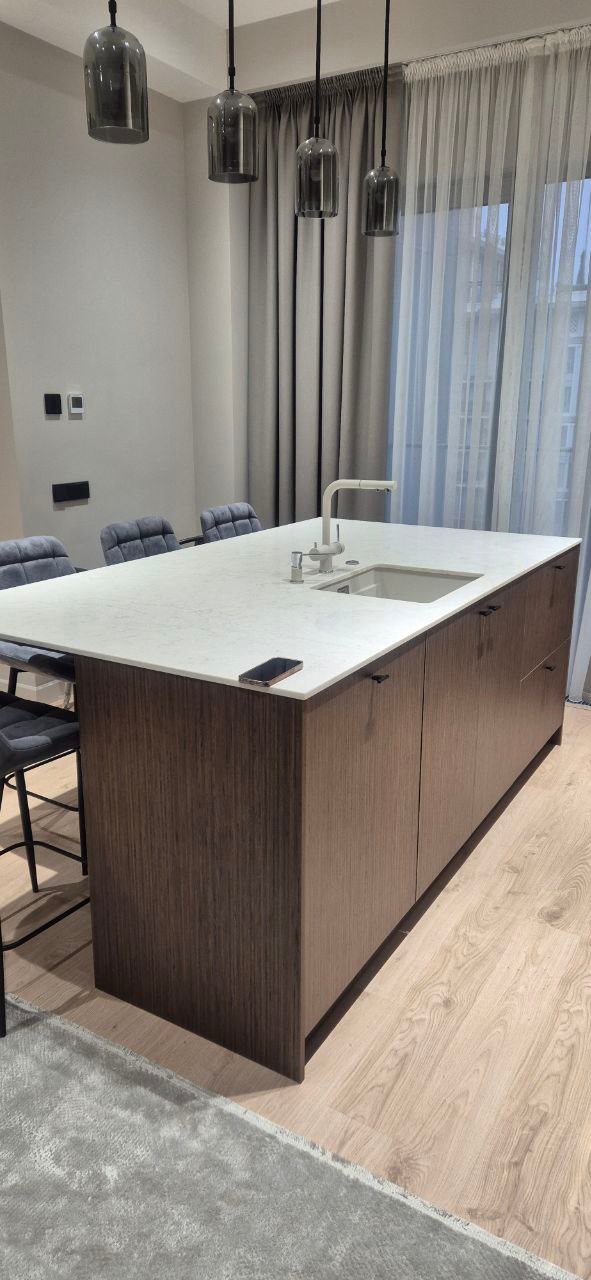 Столешница из кварца обладает исключительными характеристиками: высокая износостойкость, устойчивость к царапинам и теплоустойчивость. Это делает её не только визуально привлекательной, но и практичной для ежедневного использования. В комплекте с фурнитурой Hettich кухня становится воплощением плавности движения и эргономики. Фурнитура Hettich — это гарантия бесшумного открывания и закрывания ящиков и дверей, что создаёт комфорт даже при интенсивной эксплуатации.