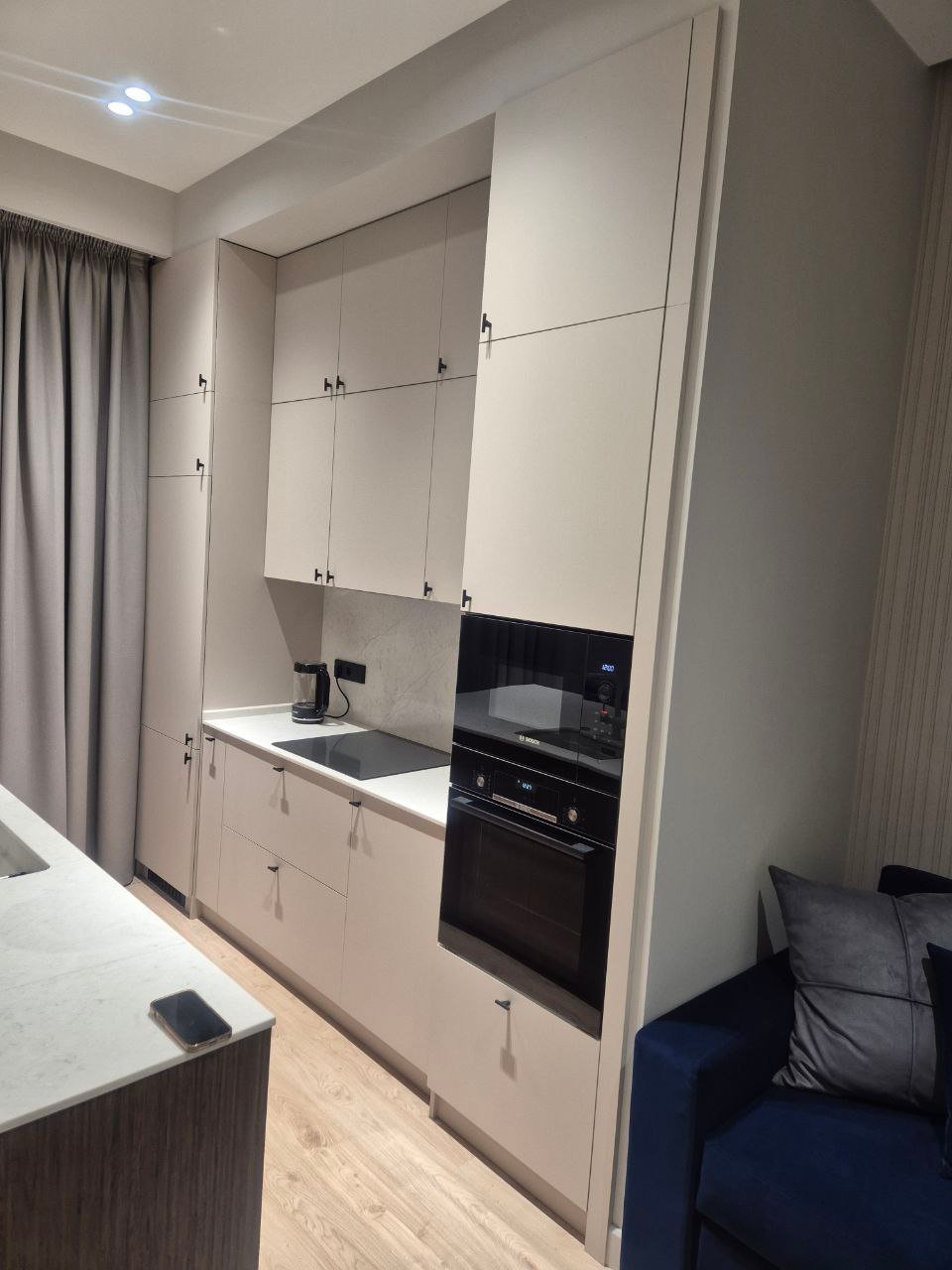 Кухня студия, материал ЛДСП Egger, столешница кварц, фурнитура Hettich