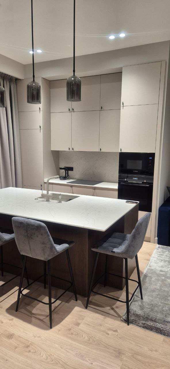 Кухня студия из материала ЛДСП Egger представлена как идеальное решение для тех, кто ценит утонченную эстетику и долгосрочную надежность. Материал ЛДСП от Egger известен своей прочностью, устойчивостью к воздействию влаги и долговечностью, что делает его идеальным вариантом для использования в кухонных пространствах. Современный минимализм дополняет кварцевая столешница, обеспечивая элегантность и практичность.